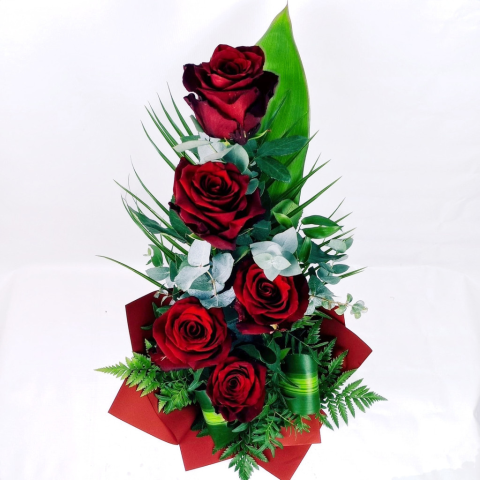Vörös Szerelem Piramisa Összetétel: Mélyvörös, bársonyos rózsa Széles, ívelt, fényes zöld levél (pl. Aspidistra) Hamvasszürke/kékeszöld eukaliptusz levelek Finom, fodros sötétzöld páfrány Hosszú, keskeny, lándzsás díszítő zöldek Ez a magas, függőle