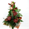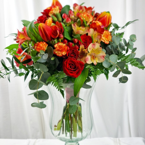 Lángoló színek virágcsokra rózsával és tulipánnal Összetétel: vörös rózsa narancsos-piros tulipán narancssárga szegfű alstroemeria (inkaliliom) dekoratív zöldek: eukaliptusz, páfrány Méretek: magasság: kb. 45–50 cm átmérő: kb. 35–40 cm Ez a gyönyörű