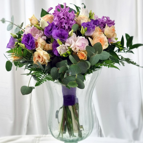 Lila-barackos álom Összetétel: Barackos rózsa Lila és halványrózsaszín eustoma (lisianthus) Lila jácint Zöld díszítő levelek: eukaliptusz, páfrány és egyéb zöldek Lila szalag a csokor megkötéséhez Ez az elegáns és kifinomult virágcsokor a romantika és