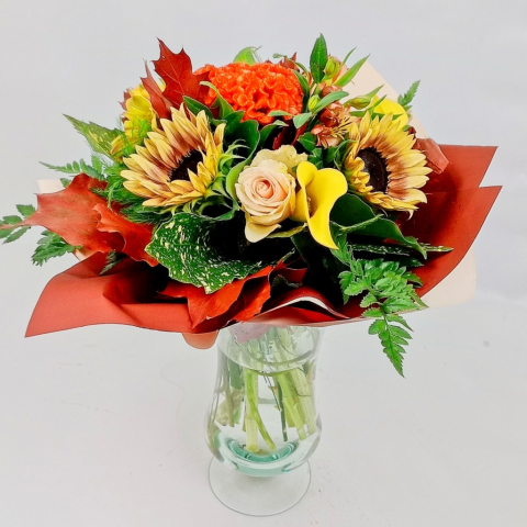 Őszi Napsugár: A bőség és a melegség csokra Összetétel: Napraforgó Narancssárga krizantém Sárga alstroméria Barackos rózsa Őszi falevelek (vörös, barna) Foltos, zöld díszítő levelek Páfrány és egyéb zöldek Barna és narancs díszcsomagolá Ez a meleg, r