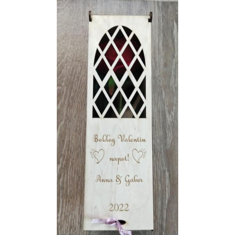 31 x 9,5 x 10 cm nagyságú fa doboz, benne élethű selyem rózsával. Előlapja gravírozott. Kérhető egyedi szövegel, melyet a rendelés végén kell megadni a megfelelő rubrikában.