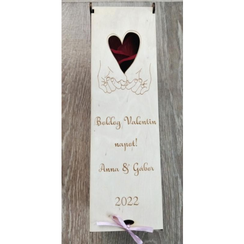 31 x 9,5 x 10 cm nagyságú fa doboz, benne élethű selyem rózsával. Előlapja gravírozott. Kérhető egyedi szövegel, melyet a rendelés végén kell megadni a megfelelő rubrikában.