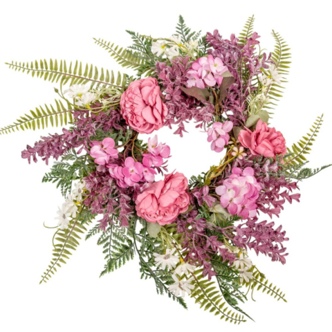 A Virágos koszorú 45 cm látványos, tavaszi-nyári hangulatú dísz, amely minden bejáratot, falat vagy asztalt feldob.A rózsaszín és mályva árnyalatú virágok harmonikusan keverednek a zöld levelekkel és fehér virágokkal, így természetes, friss összhatást kel