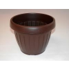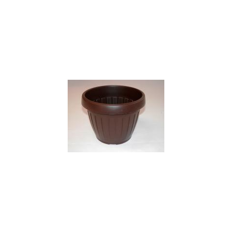 Barna színű, műanyag, hordó alakú virágtartó. Az átmérője 175 mm.