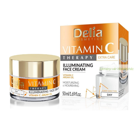 Delia Cosmetics Vitamin C Therapy világosító nappali arckrém, hidratáló, tápláló C-vitaminnal, argánolajjal. A krém ideális sminkalapként is. Intenzív ápolás minden bőrtípus számára. Hatóanyagok: C-vitamin, sheavaj, argánolaj, Q10 koenzim, allantoin. Bi