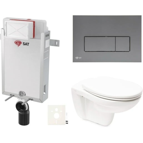 Függő WC-készlet - a készlet tartalmaz egy téglafalra szerelhető modult, egy SAT WC-tartályt SAT vezérlőgombot SAT és egy WC-ülőkét. A WC-ülőke duroplastból készült. A vezérlőgomb műanyagból készült, és pisztolymetál matt színű.