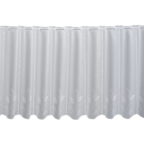 Fehér, bordűrös, alul hímzett levélmintás vitrázsfüggöny. Panelek között vágható, szegést nem igényel. Lyuksoros, vitrázspálcára felrakható. 60 cm magas, összetétele 100% poliészter. A függönyt az áruházban az Ön által kívánt méretre vágják.