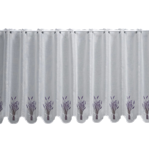 Fehér alapon levendulamintás, bordűrös vitrázsfüggöny. Vágócsík mentén vágható. Vitrázspálcára felrakható. 90 cm magas, összetétele 100% poliészter. A függönyt az áruházban az Ön által kívánt méretre vágják.