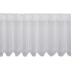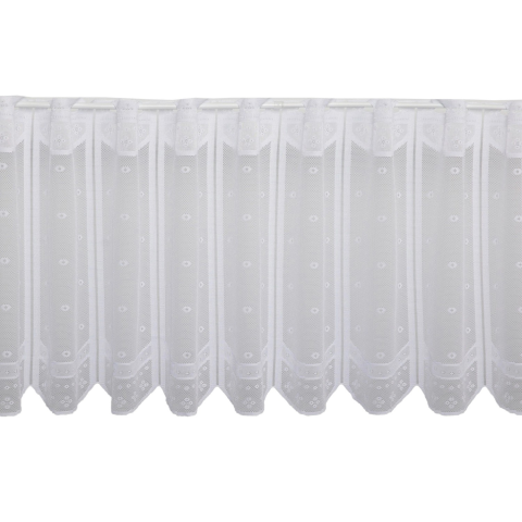 Fehér jacquard, teljes magasságában elszórtan pöttyös, bordűrös vitrázsfüggöny. Vágócsík mentén vágható, elszegést nem igényel. Lyuksorral ellátott, vitrázspálcára felrakható. 30 fokon mosható kímélő mosóprogrammal. 60 cm magas, összetétele 100% poliészter. A függönyt az áruházban az Ön által kívánt méretre vágják.