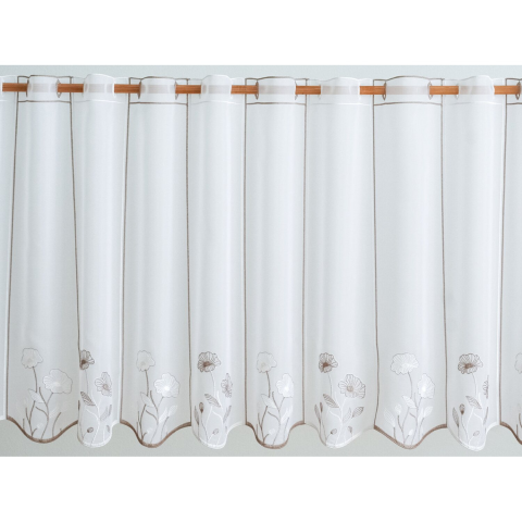 Fehér alapon barna hímzett virágos vitrage függöny vágócsíkkal és lyuksorral, 45 cm magas, összetétele 100% poliészter