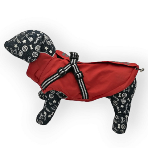 Vízálló, fényvisszaverő kutyakabát beépített hámmal, vörös L-es