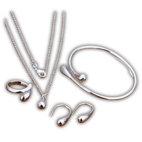 Elegáns csepp alakú ékszer szett fülbevalóval, gyűrűvel, nyaklánccal és karkötővel. Tökéletes ajándék és stílusos kiegészítő bármilyen alkalomra. Szerezd be most