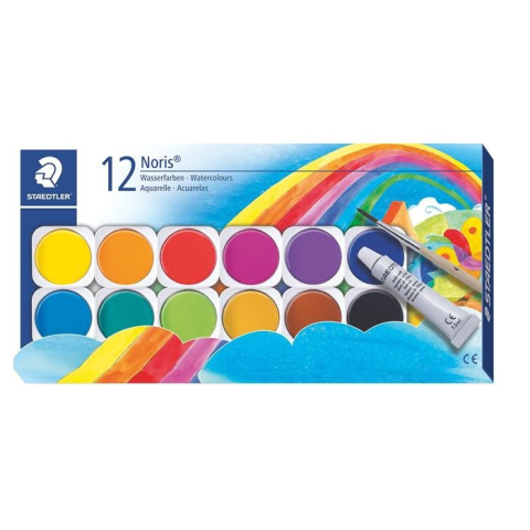 Vízfesték, 12 darabos, STAEDTLER Noris 888 -jó festhetőség -kiváló színintenzitás -12 különböző szín -ecsettel és ajándék fehér temperával Gyártó/első EU forgalmazó elérhetősége: STAEDTLER SE Moosäckerstr. 3, 90427 Nuremberg, Germany info@stae