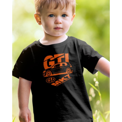 Autós gyerek póló, Volkswagen GTI Mk7. Öltözz össze autóddal vagy ha még csak álmodozol egy Volkswagen GTI Mk7 típusú autóról a gyermeked pólóján garantáltan láthatod kedvenc autódat. Lepd meg gyereked egy szuper pamut pólóval. Minőségi gyerek pólóink