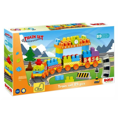 Építsd fel a saját vasútpályádat, állomás épülettel! A Vonat építőjáték 89 darabos készlet műanyagból készült színes építőelemeket, vasúti síneket és egy összeakasztható vonatot tartalmaz, mozdonnyal és vonatkocsikkal.