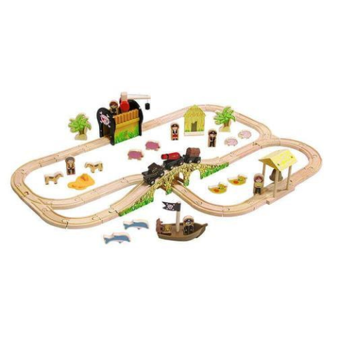 Fából készült kalózos vonatkészlet.A szett vonatot, síneket, kalózhajót, állatokat és egyéb kiegészítőket is tartalmaz. A sok tartozéknak köszönhetően könnyedén elkészíthető akár több pálya is egyszerre. A gyermekek fantáziája