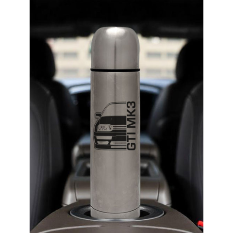 Vw Golf GTI Mk3 termosz, Volkswagen termoszok. Ajándék autómániás férfiaknak és nőknek vagy olyanoknak akik szeretik és élvezik a vezetést. Volkswagen Golf GTI Mk3 termosz télen és nyáron is kitűnő választás. Anyaga rozsda mentes acél és műanyag, 500ml-es