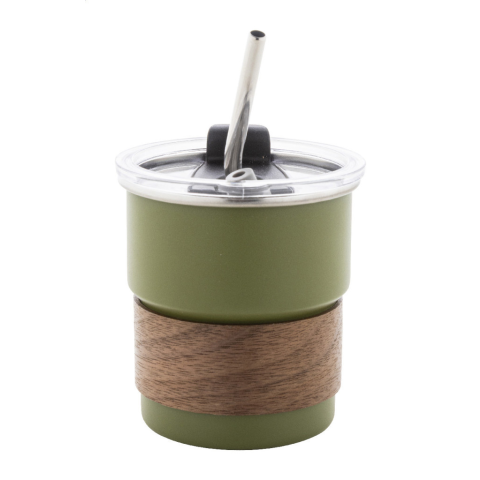 Egyfalú, újrahasznosított rozsdamentes acél utazópohár diófa markolattal, műanyag ivófedéllel és újrahasznosított rozsdamentes acél szívószállal. 260 ml.