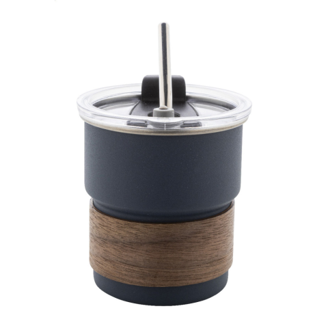 Egyfalú, újrahasznosított rozsdamentes acél utazópohár diófa markolattal, műanyag ivófedéllel és újrahasznosított rozsdamentes acél szívószállal. 260 ml.