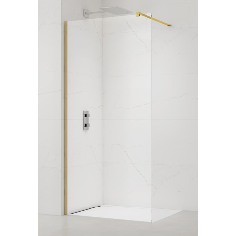 Sétálós zuhanykabin profilokkal és tekercseléssel, arany fényes kivitelben, a töltelék átlátszó üvegből készült, dekoráció nélkül. A termék Easy Clean kivitelű, ami megkönnyíti a tisztítást és minimalizálja a vízkőlerakódást. Nem nyitható - rögzített rendszer. Megjelölés - bal és jobb tájolás.