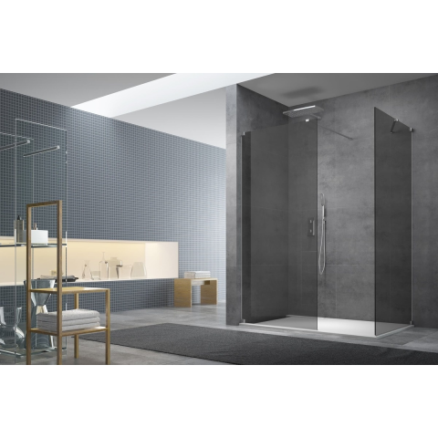 Walk-in zuhanyparaván pántokkal és merevítővel fényes krómban, a felület átlátszatlan üvegből készült és füsthatású dekorációval rendelkezik. Easy Clean felületkezeléssel, amely megkönnyíti a tisztítást, és minimalizálja a vízkőlerakodást. Összecsukható nyitórendszer. Bal és jobb oldali tájolás is.
