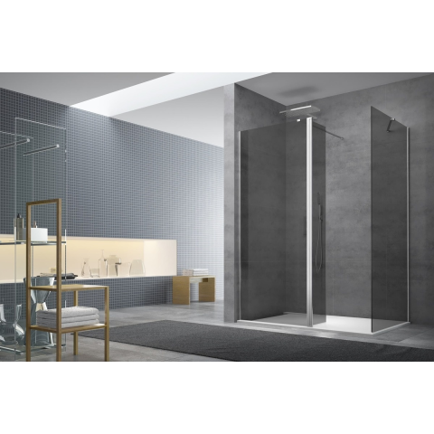 Walk-in zuhanyparaván mérete 200 cm. Összecsukható nyitórendszer. Bal és jobb oldali tájolás is. Profil fényes krómban , a felület átlátszatlan üvegből készült.