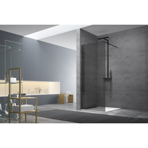 Walk-in zuhanyparaván profilokkal és merevítővel fekete színben, a felület átlátszatlan üvegből készült és füsthatású dekorációval rendelkezik. Easy Clean felületkezeléssel, amely megkönnyíti a tisztítást, és minimalizálja a vízkőlerakodást. Összecsukható nyitórendszer. Bal és jobb oldali tájolás is.