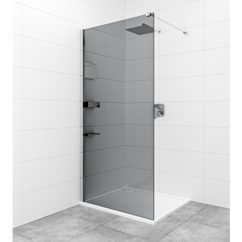 Walk-in zuhanyparaván profilokkal, szellőzéssel és tartozékokkal fényes krómban, a felület átlátszatlan üvegből készült és füsthatású dekorációval rendelkezik. Easy Clean felületkezeléssel, amely megkönnyíti a tisztítást, és minimalizálja a vízkőlerakodást. Fix - nem nyitható meg. bal és jobb oldali tájolás is.