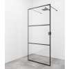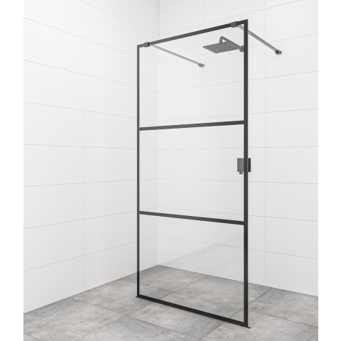 Bejárható zuhanykabin szélálló kivitelben matt fekete színben, a töltés csíkos üvegből készült, nyomtatott díszítéssel. A termék Easy Clean kivitelű, a tisztítás megkönnyítése és a vízkőlerakódás minimalizálása érdekében. Nem nyitható - rögzített rendszer. Megjelölés - bal és jobb tájolás.