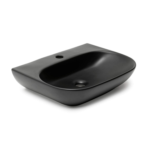 Závěsné umyvadlo černé matné barvy o šířce 50 cm a hloubce 38,5 cm. Díky broušené spodní hraně lze použít i na desku. Zátka není součástí balení.
