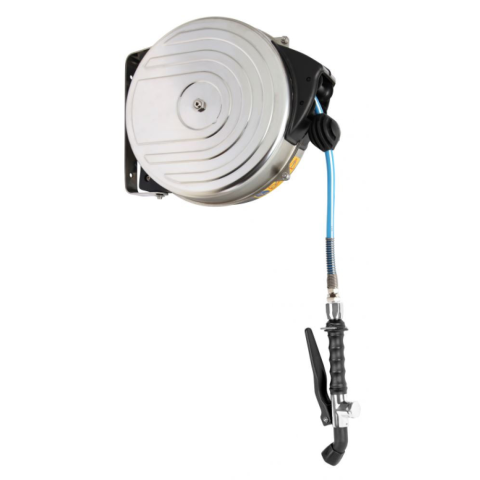 stainless steel shrouded hose reel | rubber hose ø 8x12 mm length 10 m | food grade certified - outlet ø 1/2 'M | max. temperature 25°C air - 70°C water | max. pressure 20 bar air - 10 bar water | equipped with Rapid shower ø 1/2 'F | continuous working t