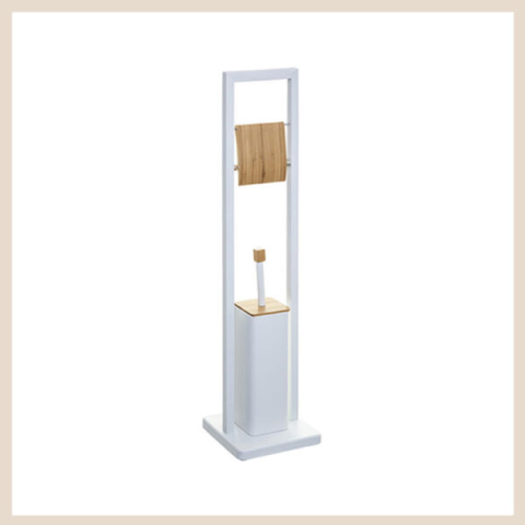 A tartó fémből és természetes bambuszból készült, matt felülettel, eleganciát kölcsönözve a szaniternek. Ez egy állvány, amely nem igényel nehéz rögzítést vagy lyukakat a falon, és könnyen mozgatható, hogy megtisztítsa a helyet, ahol elhelyezték.