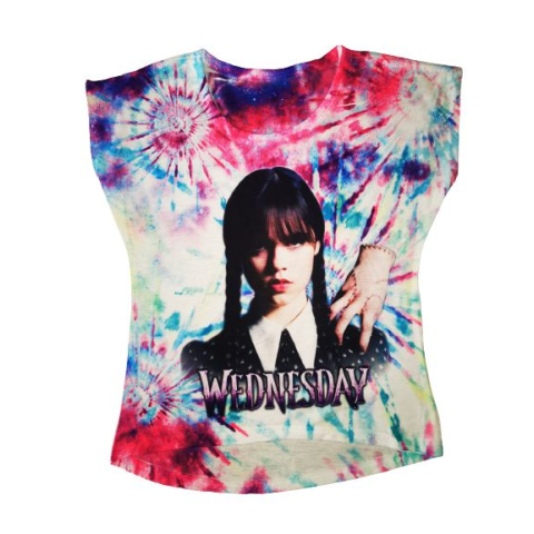 Wednesday fekete ruhát visel, és fehér gallérral, haját pedig két copfba fonja.