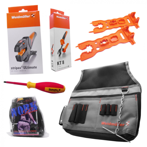 A szett tartalma: - WZTE 20 LR Szerszámos táska - 1 db - TRGU NE Szerszámos táska pánt - 1 db - STRIPAX ULTIMATE Csupaszoló szerszám 0,25...6mm2 - 1 db - SDIPM PH2 X 100 VDE-szigetelt csavarhúzó PH2 - 1 db - KT 8 Vágószerszám, átmérő max 8 mm - 1 db - MU