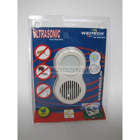 Weitech elektromos ultrahangos kártevő elriasztó A hatótávolság 90m2 Ajánlott: egér, bolha, kullancs, pók, csúszó-mászó ellen. -közvetlenül 220V-ba helyezhető -20000Hz-45000Hz között bocsát ki ultrahangot -látható eredmények 72 óra után Max. 0,8 Watt ener