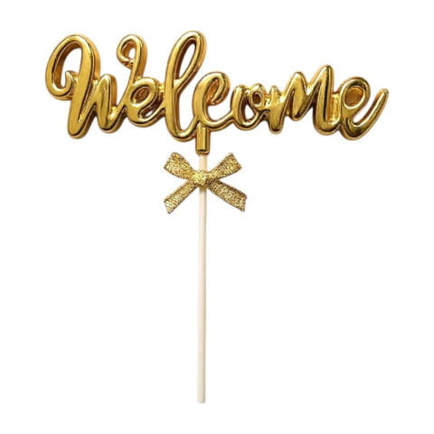 \nKöszöntsd vendégeidet stílusosan ezzel a csillogó arany színű Welcome tortadísz beszúróval! Elegáns és ünnepélyes kiegészítő, amely különlegessé varázsolja a tortát bármilyen eseményen – legyen az esküvő, házavató, születésnap vagy céges rendezvény.