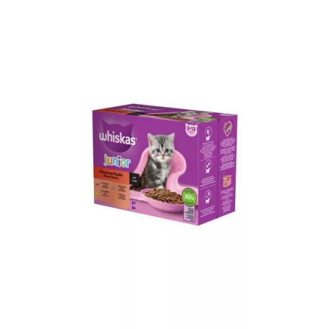 Whiskas Junior Klasszikus válogatás 12 hónaposnál fiatalabb kiscicák számára 12x85g Teljes értékű nedves eledel ami 100%-ban biztosítja a kölyök macskák napi szükségleteit Doboz tartalma: 12x85gr (4x3 féle ízkombináció) -3x Marhával -3x Csirkével -3x Bárá