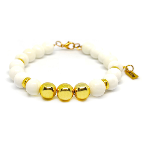 Figyelem! Nem szakad, nem nyúlik! Tartós ékszer. Az ékszer ásványai és tartozékai: – 8 mm-es kagylógyöngyök – 8 mm-es arany színű hematit gyöngyök – Arany színű díszek – M.King márkajelzésű nemesacél logóbiléta a csatnál