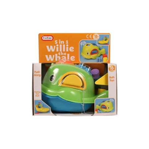 Willie, a kis bálna élménnyé teszi a fürdést! A Willie a bálna 5 az 1-ben bébijáték egy műanyag halacska, ami rengeteg meglepetést tartogat a gyerekek számára! Willie hátán és oldalán formaválogató játékokat lehet játszani, de a bálna vizet is tud spriccelni. A bálna kinyitható, és a kis halász figura csónakázni tud rajta. A Willie a bálna 5 az 1-ben bébijáték úszik a víz felszínén, nem fog elsüllyedni, a készlet a különböző színű műanyag formákat