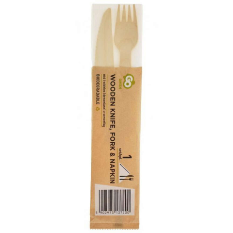 Wooden, Fa villa és kés szalvétával  Tartalma: villa, szalvéta (ECO)  Mérete:16 cm.