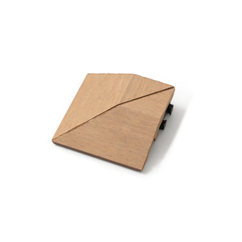WPC kültéri padlóburkolat sarok záróeleme.A WPC (wood plastic components) rövidítés a termék összetételére, azaz farost 60% és műanyag 40% keverékére utal. Nyomás és hő hatására, vagyis extrudálással ellenálló és karbantartá