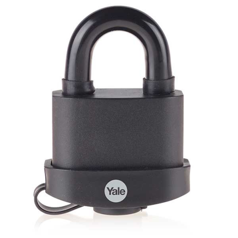 Yale-Y220B/61/123/1 időjárásálló acél lakat • lamellás acél lakattest• edzett acél kengyel• dupla acélgolyós reteszeléssel• korrózióálló belső szerkezet• védőburkolat a testen és a bilincsen• szennyeződés és a víz elleni védelem• műanyag kupak védi a k