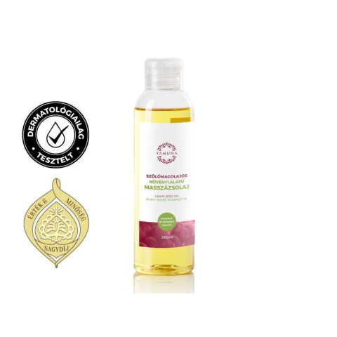 A szőlőmagolajos Yamuna masszázsolaj vitaminokban és ásványi anyagokban gazdag, használható bőr- és testápolóként is. Paraffin és színezék mentes.