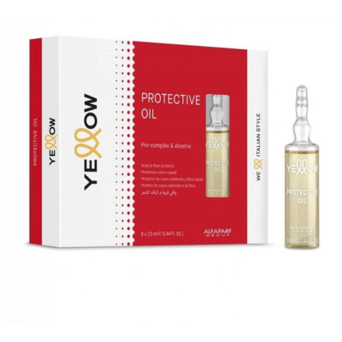 Yellow Protective Oil Fejbőr és Hajrost védő 6X13 ml YEL-POIL6*13 Fejbőr és Hajrost védő: Egy különleges kettős hatásu szérum Pro-complex-szel Aloetrix és védő hatóanyagok keveréke, a festési és a szőkítési szolgáltatások hatása alatti használatra.