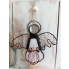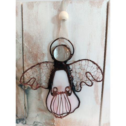 Tiffany technikával üvegből készült, rézdróthálóval diszített zenélő angyal ablakdísz. Mérete: 10 cm magas