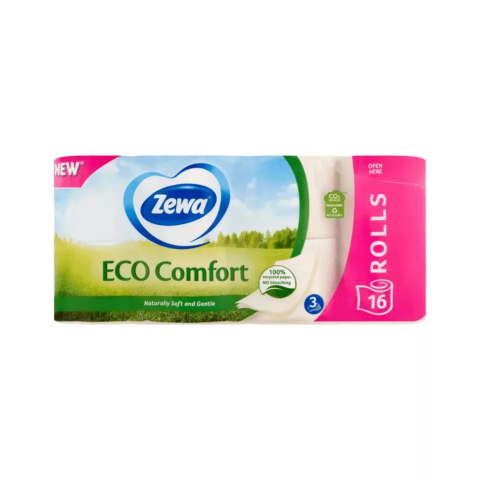 Zewa Eco Comfort 3 rétegű toalettpapír 16 tekercs Az egyetlen, toaletten lehúzható WC-papír guriga!Természetesen puha és gyengéd a bőrhöz100%-ban újrahasznosított papírból, fehérítés nélkül Egy kis hozzájárulás a környezetvédelemhez. 16 tekercs, 3 rétegű, 150 lapos, lap méret kb. 12,9 x 9,4 cm, kb. 1,8 m²/tekercs (+/-5%), 29,1 m²/ csomag (+/-5%).