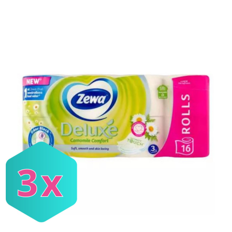A Zewa Deluxe Camomile Comfort, kamilla illatú 3 rétegű toalettpapír. A wc papír kellemes kamilla illatot áraszt a mellékhelyiségben. Ez a fehér wc papír gyengéd puhasággal biztosítja bőrének az alapvető gondoskodást. A dombornyomású Zewa-embléma pedig