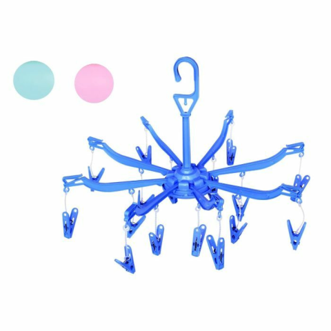 Összecsukható akasztós műanyag körhinta szárító, 16 csapot tartalmaz, kibontott átmérő kb. 50 cm és magasság 22 cm összezárt állapotban