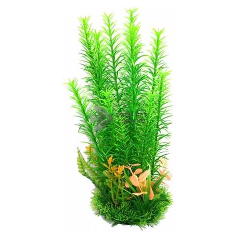 Zöld hosszú szárú akváriumi műnövény színes növény teleppel. Mutatós, természetes hatású dísz. A dekorációs szerepe mellett a díszhalaknak is rejtekhelyet nyújt, ami nagyban növeli a komfortérzetüket. Élő növényekkel együtt is behelyezhető, remekül kiegészíti a látványvilágot. Talpa nehezékként szolgál, stabilan az akvárium alján tartja a műnövényt. Magassága kb.: 29 cm.