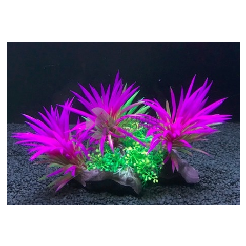 Zöld-lila tengerifű akváriumi műnövény kisebb növényekkel. Mutatós, természetes hatású dísz. A dekorációs szerepe mellett a díszhalaknak is rejtekhelyet nyújt, ami nagyban növeli a komfortérzetüket. Élő növényekkel együtt is behelyezhető, remekül kiegészíti a látványvilágot. Megfelelő fényviszonyok között látványosan élénk színben pompázik. Talpa nehezékként szolgál, stabilan az akvárium alján tartja a műnövényt. Magassága kb. 15cm, talp széles